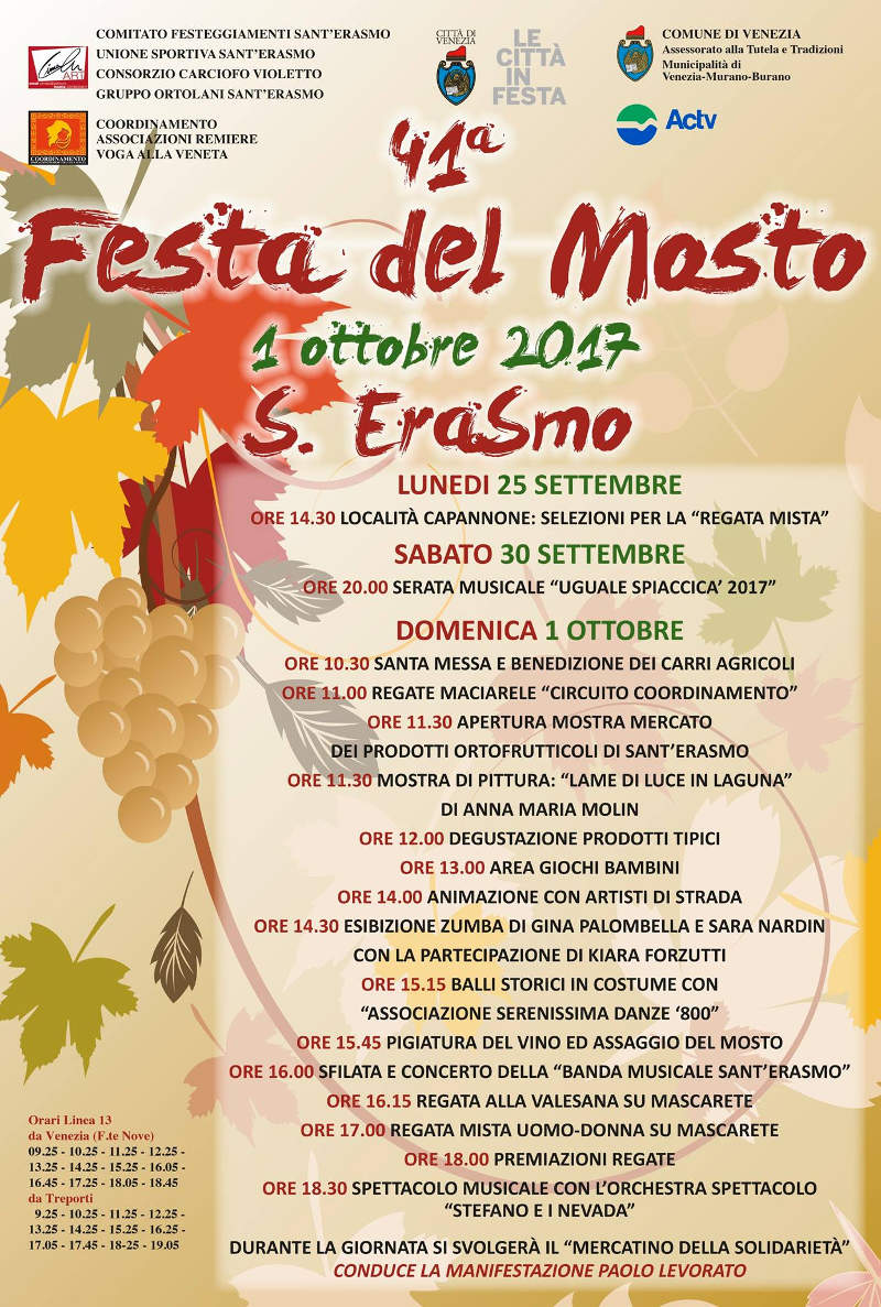 Di seguito pubblichiamo il programma della Festa del Mosto di Sant'Erasmo 2026: